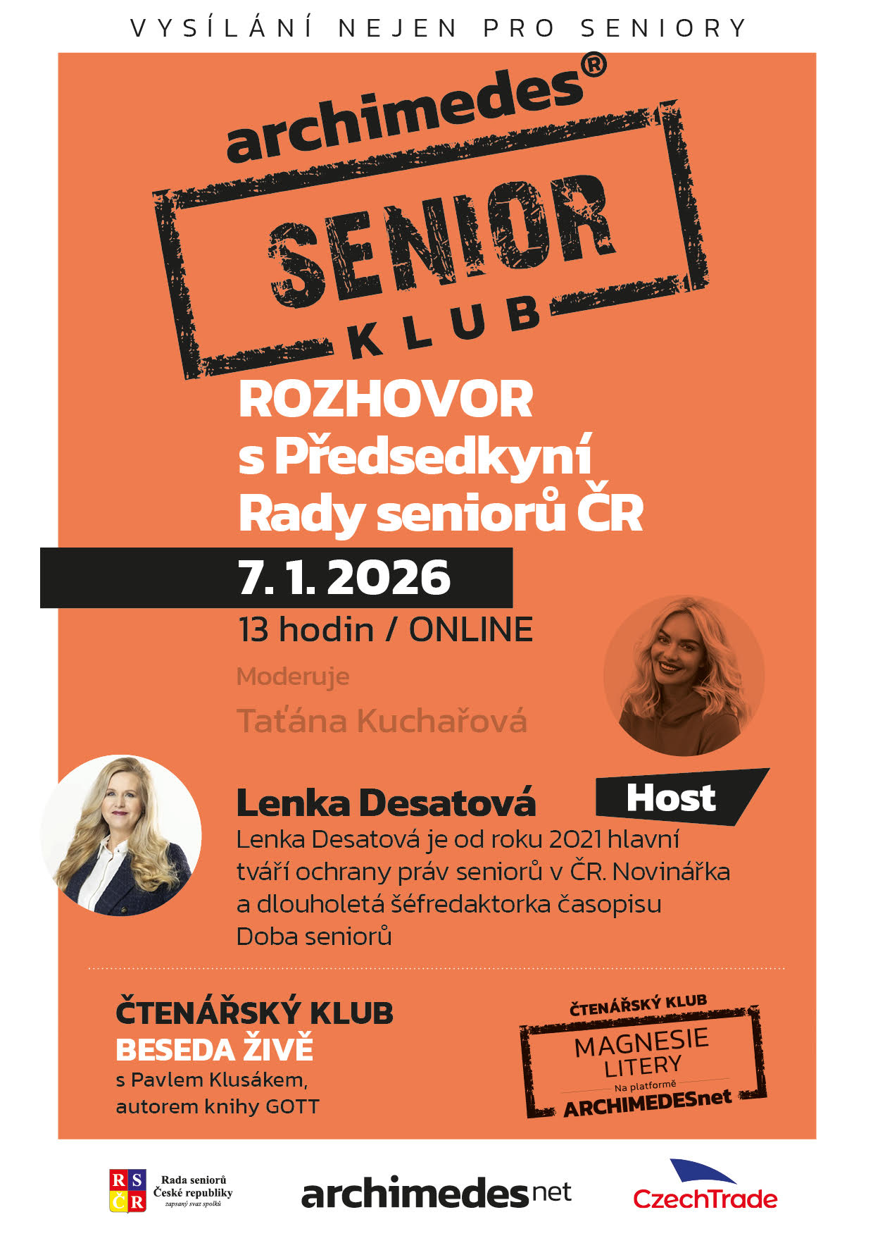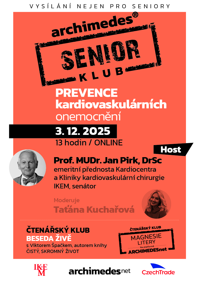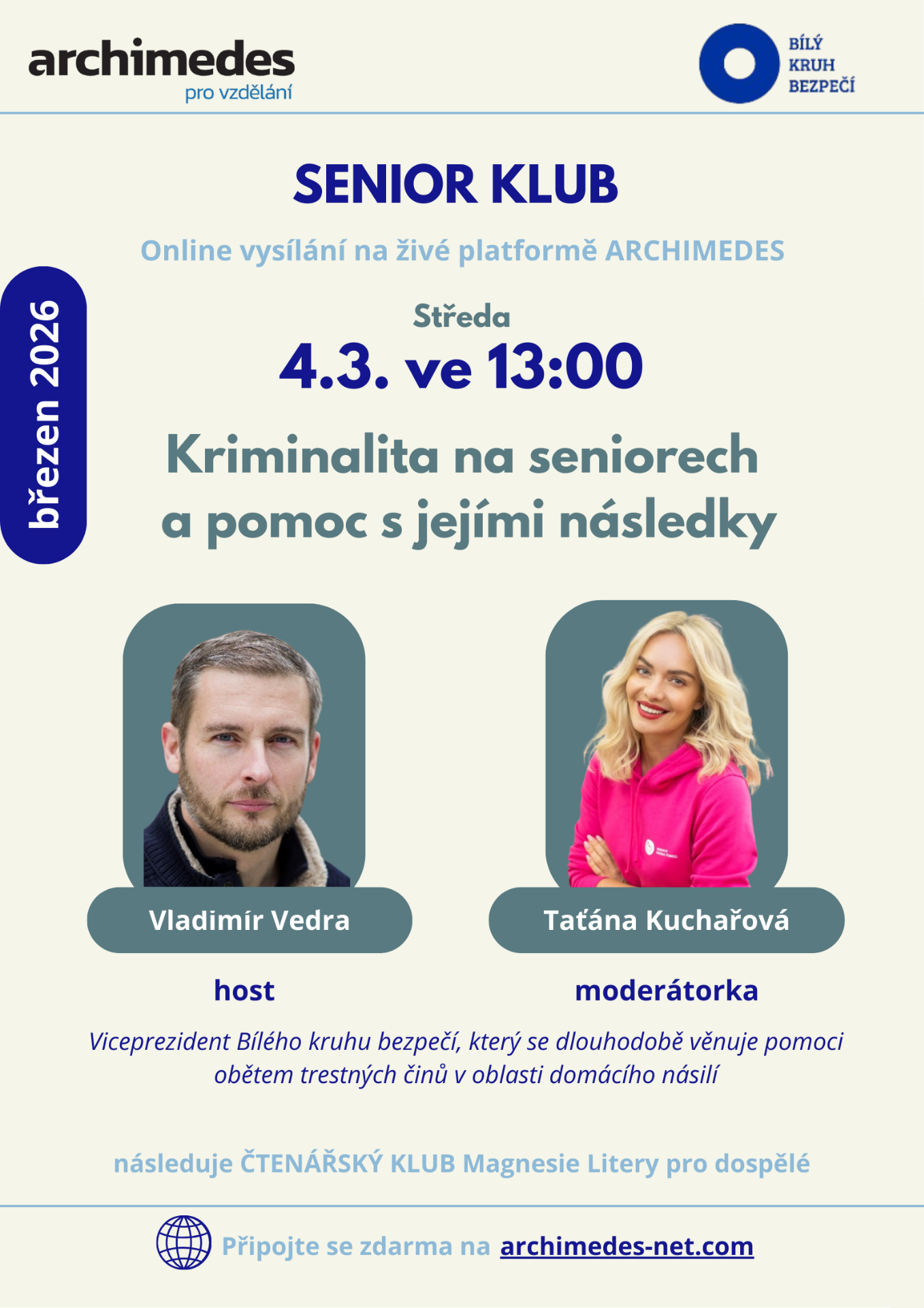 Každou první středu v měsíci ve 13.00hod vysíláme pořad pro seniory. Jedná se o moderovaný rozhovor se třemi hosty, vždy na zvolené téma. Propojujeme se také do zahraničí a senioři tak mohou poznat dané téma i očima seniorů v jiných zemích. Vysílání je on-line, odkaz je po registraci automaticky odeslán. Dotazy jsou z učeben ARCHIMEDES zadávány živě, ostatní pomocí chatu. Připravujeme soutěže mezi seniorskými kluby a výměnné zájezdy.